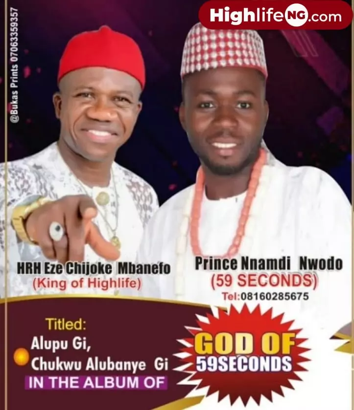 Goodnews Enterprises present Igbo highlife singers, Prince Nnamdi Nwodo featuring KING of highlife music, Prince Chijioke Mbanefo in this music titled Alupu Gi (Chukwu Alubanye Gi) from the album God of 59 seconds in audio mp3 format below: